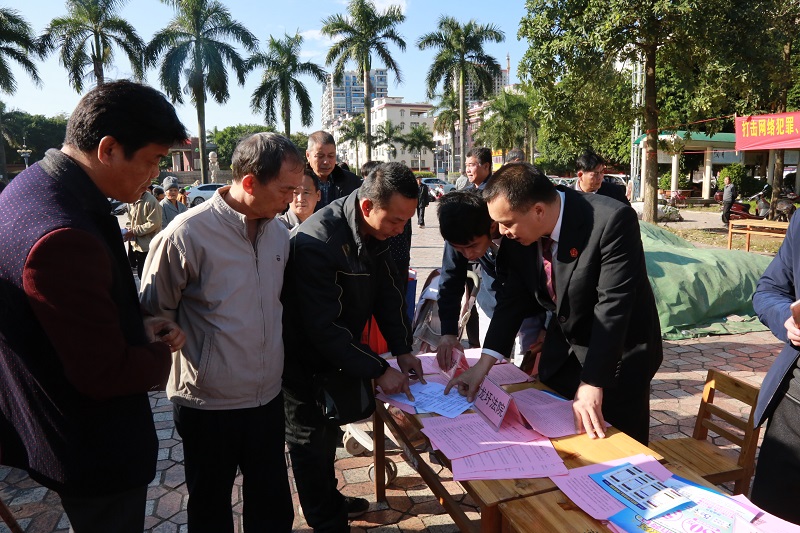 121日,龙圩法院的法官积极参加龙圩区组织开展的2017年“12?4国家宪法日”集中宣传活动,在龙圩区世纪广场开设摊点,法官走上街头,向群众发放宣传资料,向广大市民宣传十九大精神,普及法律知识,并现场解答群众的问题,给群众们送去十九大精神文化大餐和贴心的特色司法为民服务。