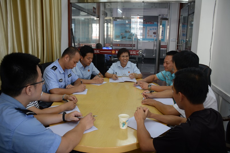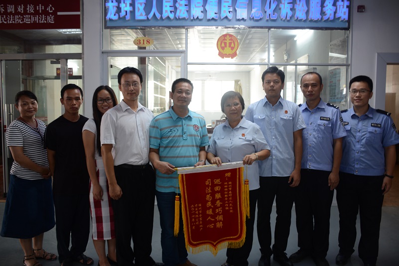 8月22日下午,碧桂园凤凰城(合富房地产公司)项目总经理助理朱锐林一行五人把一面印着“巡回服务巧调解 司法为民暖人心”的锦旗,送到了巡回诉讼服务工作组的潘群清法官手中,对法官公正执法的办案态度和为民解忧的司法精神深表敬意,特地送来锦旗以示感谢。 在巡回诉讼服务工作中,面对受送达人不在其身份证记载的居住地居住、不在原告方提供的地址居住等因素影响,巡回诉讼服务工作组以节假日送达、夜晚送达、蹲点守候送达等形式,跋山涉水,多方寻找当事人,尽最大的努力尽快将法律文书送达当事人。在送达过程中,坚持释疑解惑,调解优先的工作原则,因地制宜尽可能地组织当事人进行调解,释法明理,努力实现案结事了,确保达到法律效果与社会效果的统一。最终在法官的不懈努力下,巡回诉讼服务工作组办理的5件以合富房地产公司为原告的案件,其中 4件案件经调解解决纠纷,原告主动提出撤诉,1件案件成功调解,双方当事人表示非常满意。